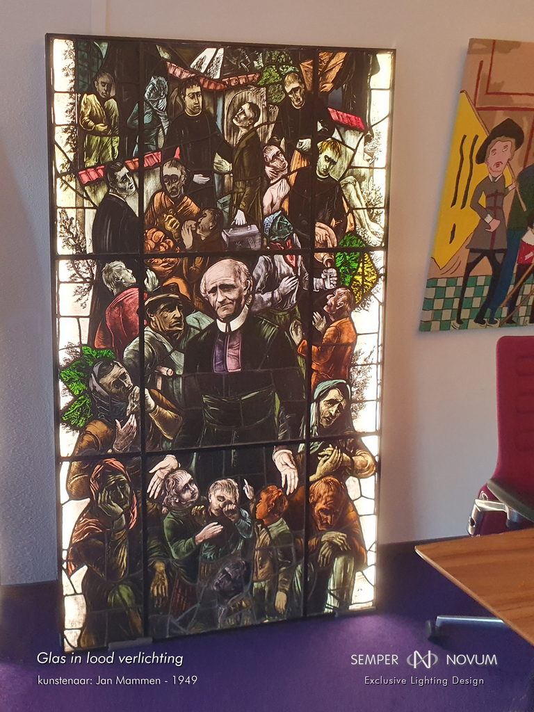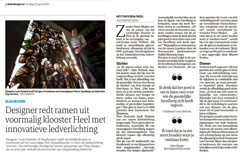 Vorige week mooi artikel in de krant t.g.v. aanbieden van een groot verlicht glas-in-lood raam aan Peter Muijen. Hij is bestuursvoorzitter van zorginstelling Daelzicht en heeft op 30 april afscheid genomen. Op het raam uit 1949 is Mgr. Petrus Savelberg afgebeeld, oprichter van zorginstelling St. Joseph in Heel; de voorloper van Daelzicht.